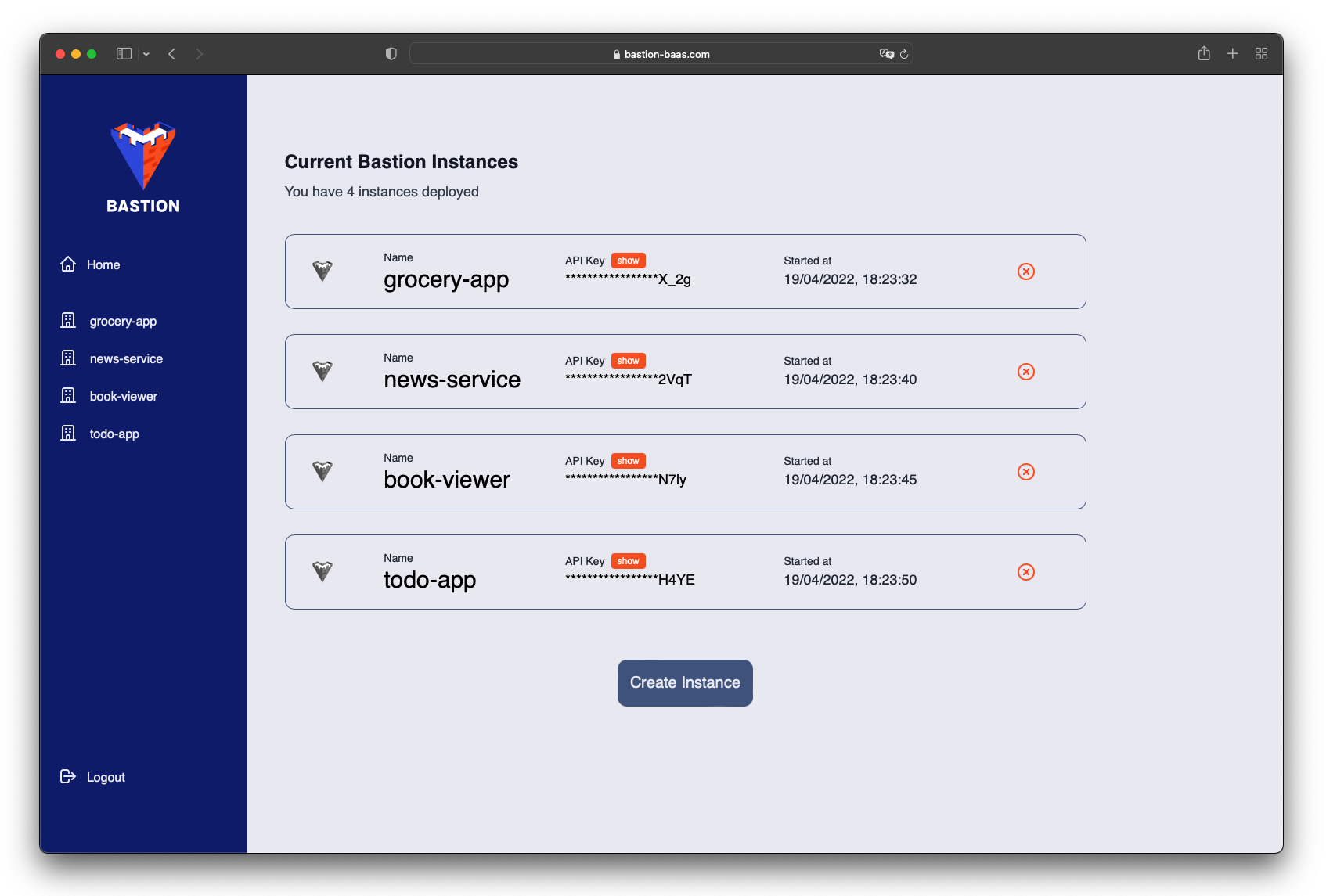 Bastion is a customizable, open-source Backend-as-a-Service that gets deployed to the cloud with AWS, allowing a front-end developer to quickly set up a backend while maintaining control of the code and infrastructure.